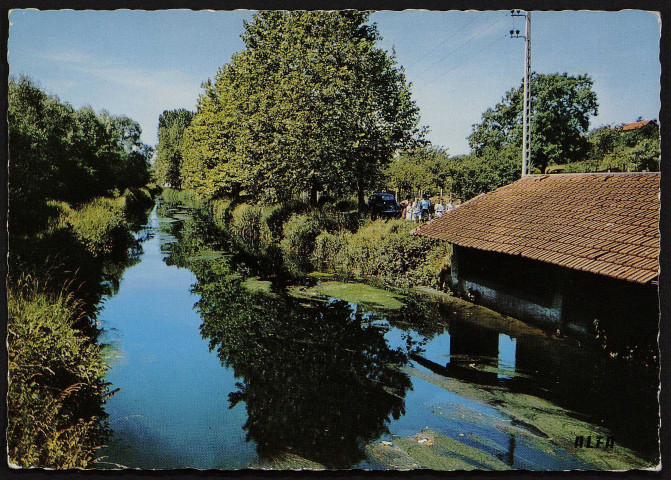 Un lavoir sur la rivière d'Orge. Quelques personnes se promènent le long du cours d'eau.
