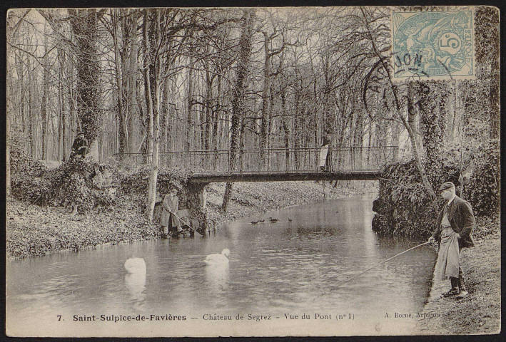 Une partie du parc du château. Présence de quelques personnes dont certaines pêchent à la ligne dans la rivière. Une femme se tient sur la passerelle au-dessus de l'eau.
